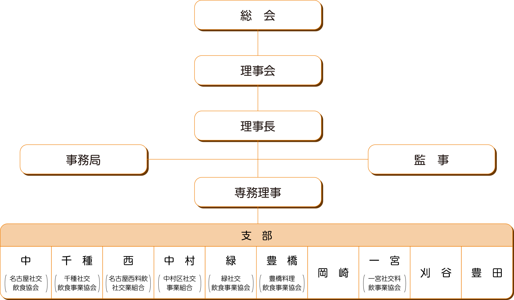上部組織の全国社交飲食業組合、愛知県社交飲食業組合と県下の各支部が一体となり公的資金の有利な融資、各種講習会、各種表彰などを実施し、組合員のメリットとし反映される仕組みになっています。